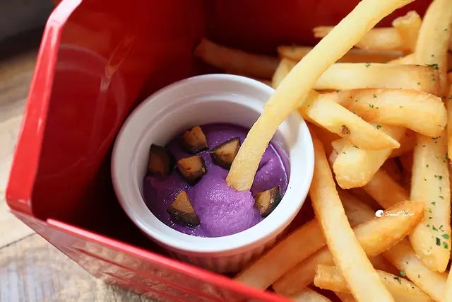 嫰雞凱蕯三明治 - 三明治旁附上了薯條、紫地瓜泥佐鐵蛋。