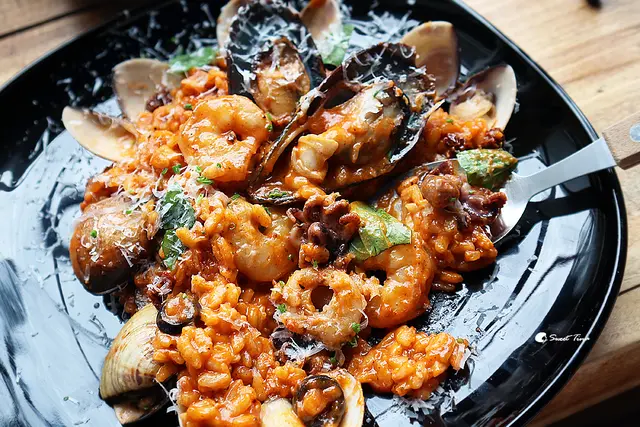 西西里海港蕃茄燉飯 - 相較於工具箱,這份燉飯就較為精巧,一盤裡可說是滿滿的海鮮,有蝦仁、淡菜、小章魚、小花枝、蛤蠣,吃進了淡水的海鮮美味。
