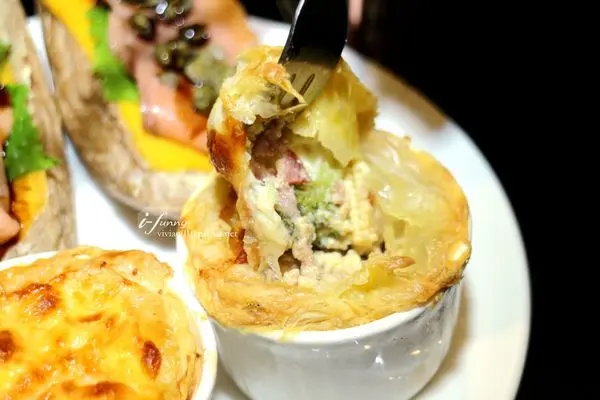 另一旁是鹹派,層層香酥的酥皮下包覆著火腿、玉米筍及綠花椰等蔬菜。