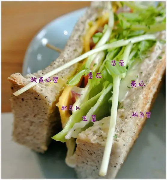 阿餅餅點的是基礎款的鮪魚起司酸黃瓜全麥吐司,