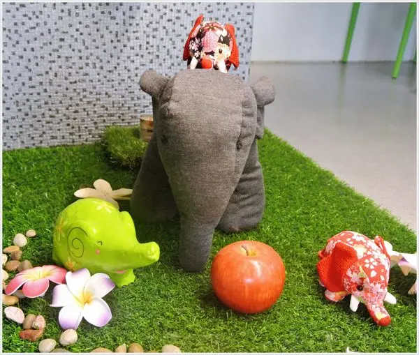 綠色基底,一大堆的大象擺飾,就像是大象在草地上的感覺