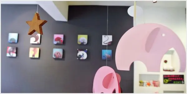 牆壁上也有許許多多大象的畫作,一些插畫整齊的陳列,