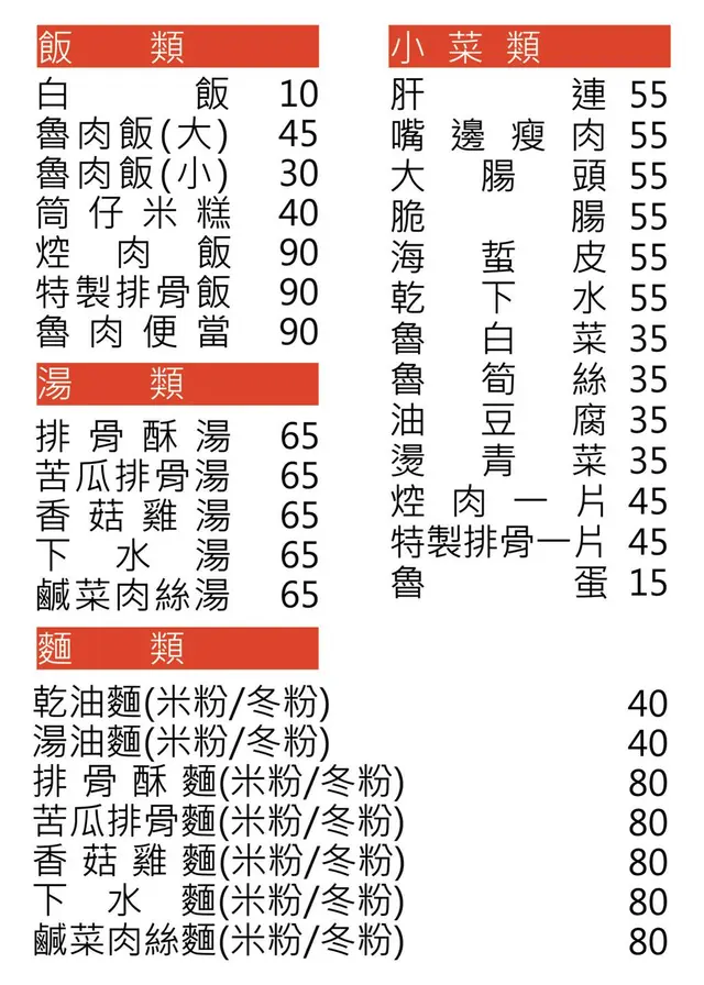 下港排骨酥湯菜單,主食有魯肉飯、筒仔米糕、焢肉飯與排骨飯等等,再來就是湯品跟一些小菜,便當類大部份都是85元一個,排骨酥湯是它們最有名的,反正來這算是必點,整體價格不算太貴。