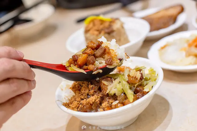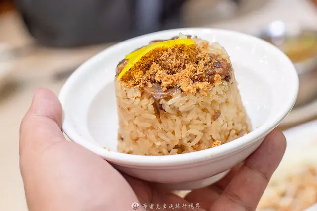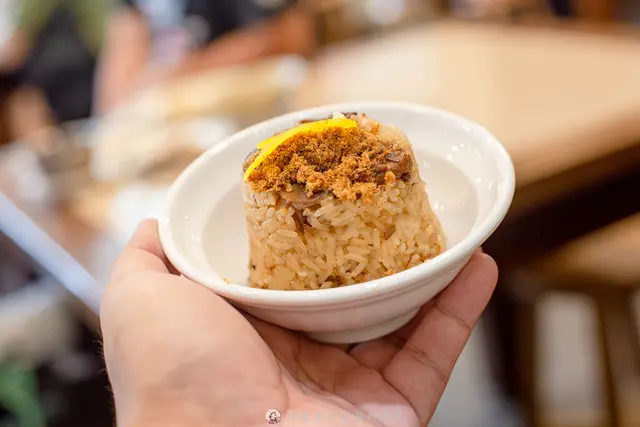 《下港排骨酥湯》的筒仔米糕聽說也是必點之一,肥瘦比例各半,有加上肉鬆是吃起來比較沒有那麼習慣,米糕口感偏軟,但整體來說比較乾一些,建議一定要加甜辣醬下去,會讓整個米糕吃起來更香甜一些,但不是我愛的那種米糕。
