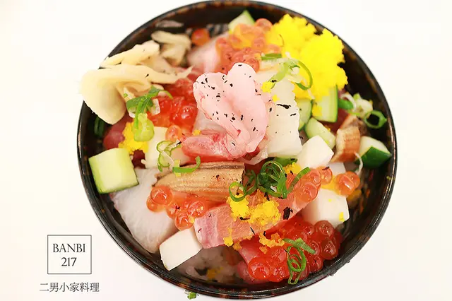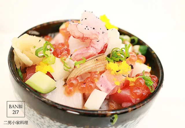 配料新鮮且豐富!有鮪魚泥、鮭魚、竹莢魚、海鱺、穴子、鮭魚卵、胭脂蝦、蝦卵、小黃瓜、山藥、蔥花。我不是評論生魚片的專家,但我覺得生料表現挺好的!該鮮甜的甜、該有油脂的有、該Q的Q,而且新鮮沒腥味!(配料主要為鮪魚泥、鮭魚、竹莢魚、海鱺、穴子、鮭魚卵、胭脂蝦,會因應當天情況而有所更換)