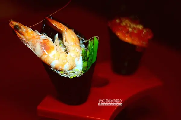 第一次看到整隻蝦子在手捲上頭跟人打招呼,擺一隻這麼大的蝦子其實還滿不合邏輯的啦,這叫我要怎麼一口咬下去呢?所以還是把蝦子和蘆筍手卷分開來吃,先咬口蝦子再咬一口蘆筍手捲,蘆筍青脆冰冰涼涼的,裡面還有生菜沙拉和芽菜,吃起來滿清爽的!
