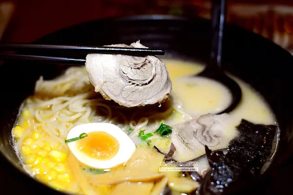 三大片肥瘦比適中的叉燒肉、半顆入味蛋黃熟度剛好的溫泉蛋、加上些許夠味的筍乾、咬起來卡滋卡滋的切絲黑木耳、以及增加甜度的玉米粒