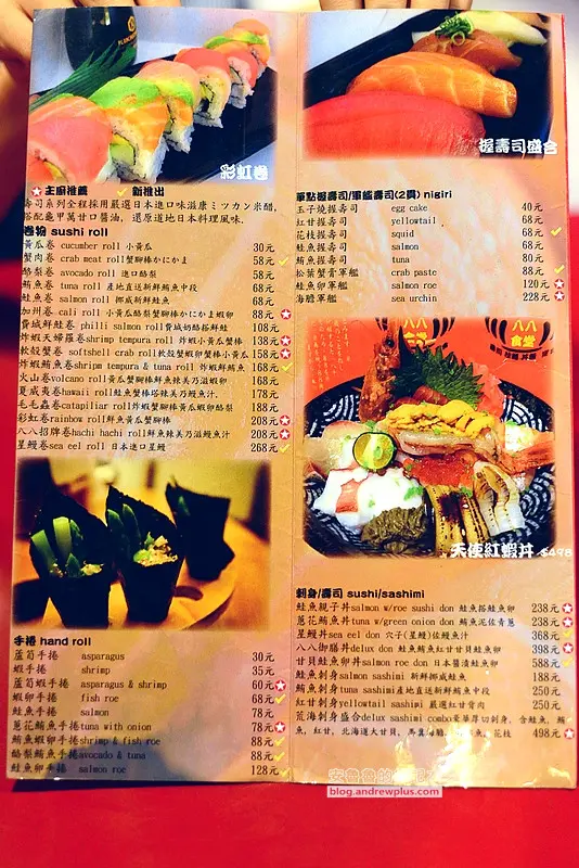 干貝吃起來還滿鮮甜的,口感像布丁般的軟嫩,鰻魚甜甜的,鮭魚厚實而且綿嫩,蟳味棒口感很好,比目魚肉肉質就稍微扎實了點,安魯魯還是比較愛吃油滋滋的比目魚鰭邊肉,花枝和章魚吃起來一個是Q另外一個是脆~黃色的魚卵增添了卡滋卡滋的口感,另外旁邊有粉紅色的糖~還頗特別的!