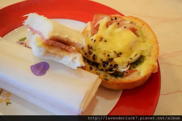 圖片上的千層派不見了,拿到的是2個三明治與焗麵包