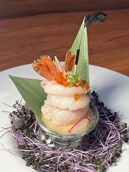 超有創意的海鮮料理,用一大尾新鮮的大蝦、搭配炙燒過的生食級干貝,佐上一些鮭魚卵~