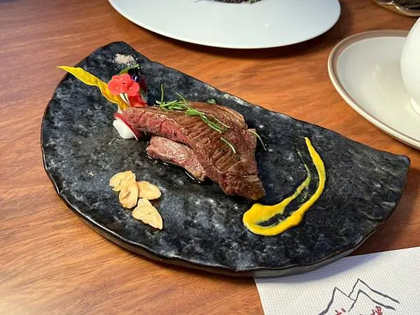 軟嫩多汁的肥美和牛,口感非常的滋潤,搭配蒜片跟薯泥,跟牛肉湯汁一起入口,感受到幸福的滋味~