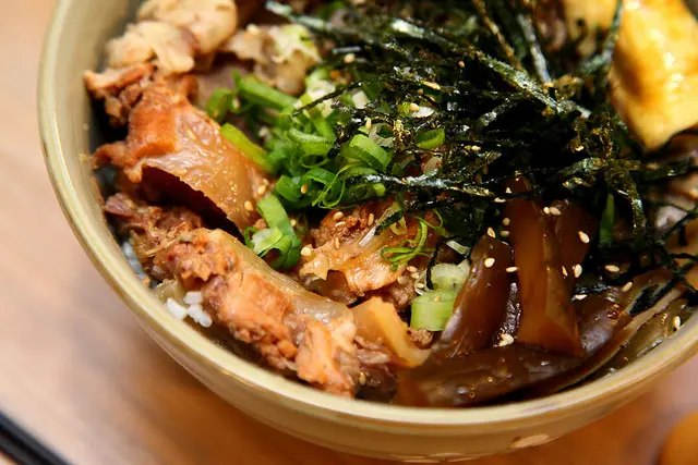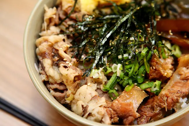 有豬軟骨,牛培根,軟嫩煎蛋以及特製的醬菜,上頭在擺上大量的蔥花跟細海苔