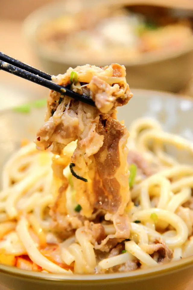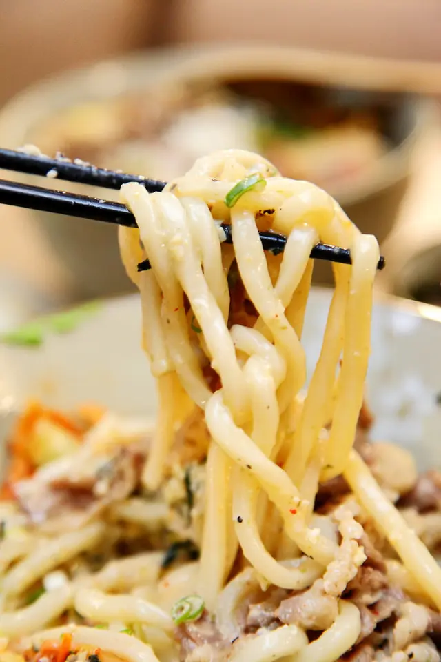 口感超級紮實,越咀嚼越能感受烏龍麵回彈力道跟牙齒相抗衡,怪不得老闆說吃這碗麵"很累"!