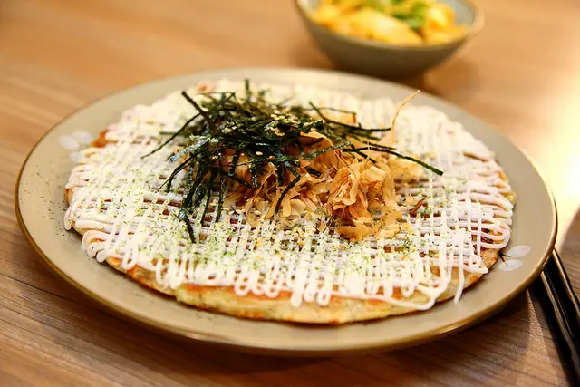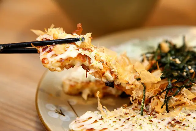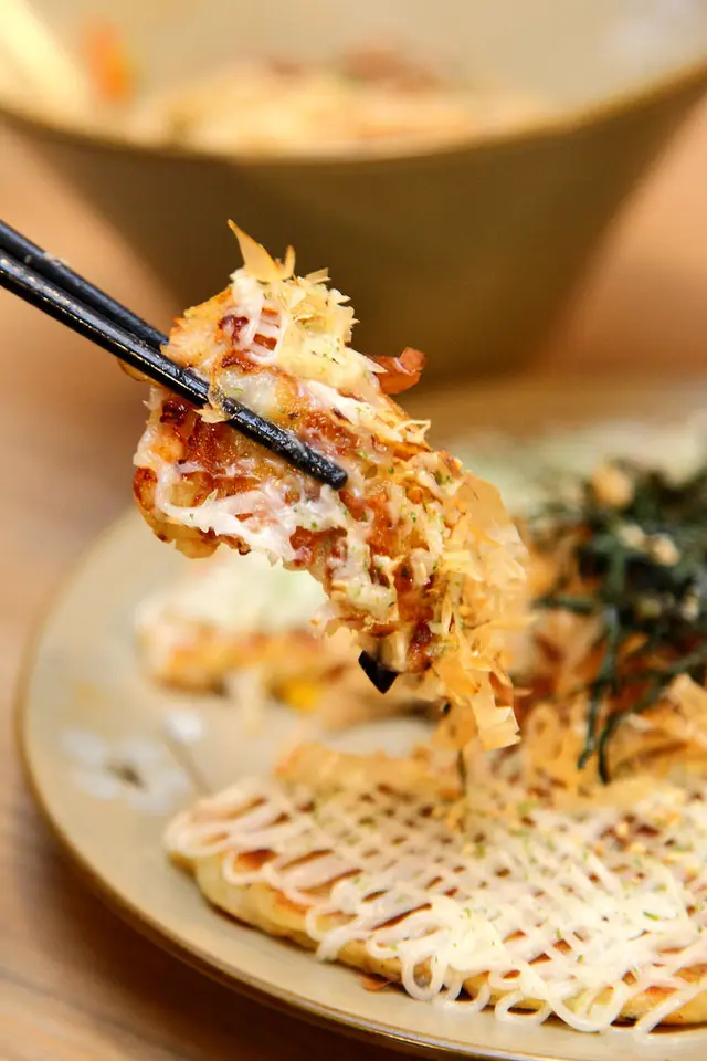 外表看似一般的大阪燒,只是厚度稍薄,上面的柴魚片還會隨著熱氣跳舞