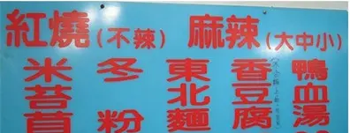店內有分成紅燒(不辣)跟麻辣口味,主餐有香豆腐,鴨血湯,跟東北麵,冬粉,還有米苔目三種!