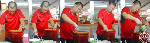 老闆在大木缽裡加入調味料,再抓一大把青木瓜絲