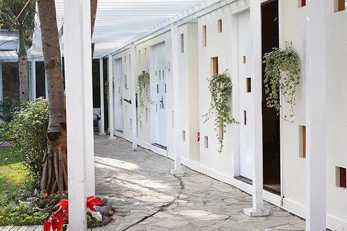 小庭園的空間不算太大但佈置成米白色迴廊和教堂及眼前的一片綠地