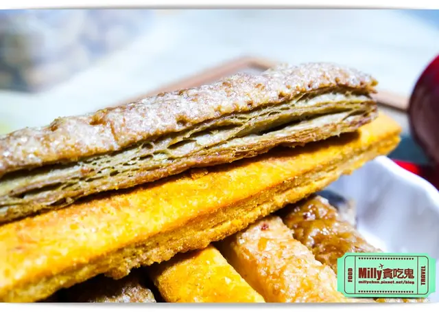 看看這千層酥斷面秀,層層分明,酥鬆口感讓人很難抗拒,上頭砂糖顆粒還會在嘴中彈跳!