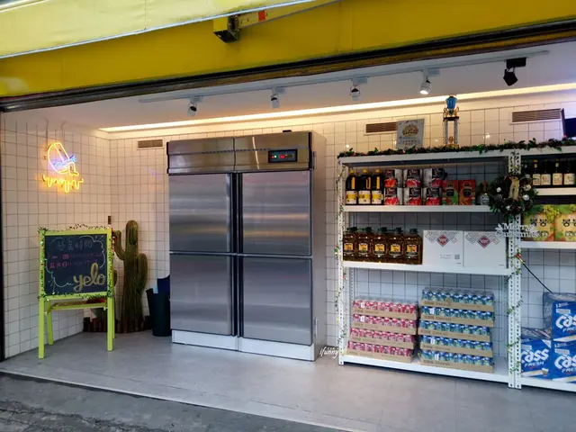 來到YELO Seoul Bistro首爾餐酒館的門口,見到貨櫃上呈列著貨品,然後一旁有個大冰箱,會以為來到超市裡,然後卻找不到大門在哪?原來把一般商業用的大冰櫃,改成餐廳的大門,所以打開冰箱就可以直接走進去了喔!