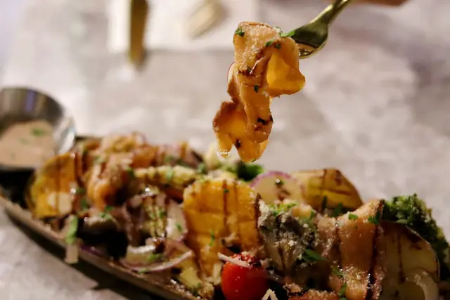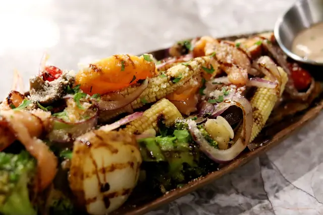 這道碳烤蔬菜用料很多元,有洋蔥、綠花椰、玉米筍、馬鈴薯、地瓜、小蕃茄等,淋上少許紅酒醋及帕瑪森起司,可以吃到食物的原始風味。