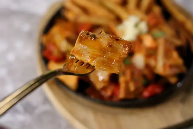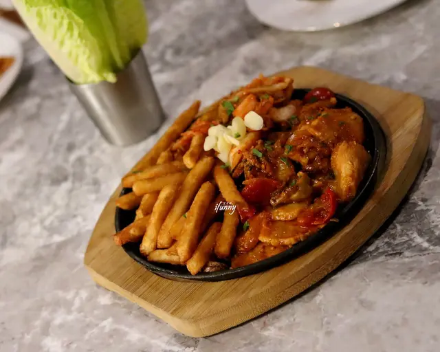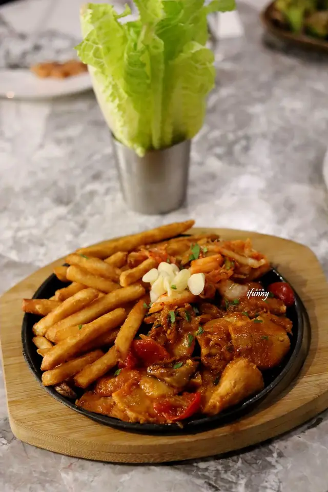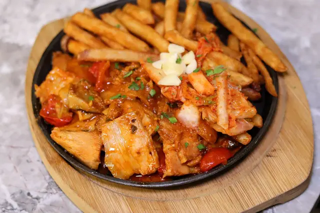 以鐵板呈現熱呼呼的感覺。附有炸薯條、蒜片及韓式泡菜。