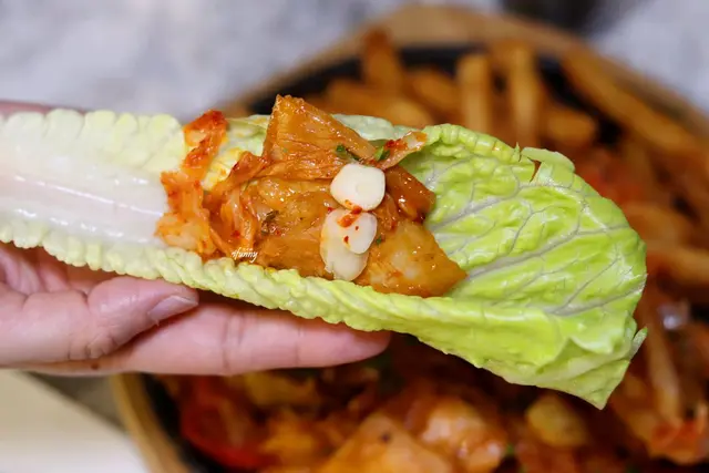 把蘿蔓葉放上五花肉、韓式泡菜及蒜片,然後捲起來再一大口吃掉,這實在好過癮啊!