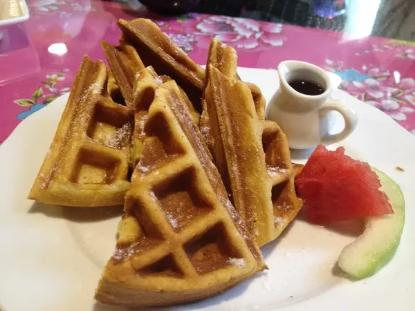 淋上一點楓糖多了糖香氣搭配鬆餅的麵粉香