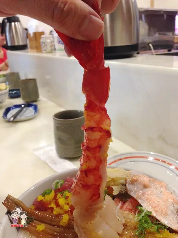 二男海鮮丼最引人注目的就是最上頭的這隻色澤紅潤的大頭胭脂蝦,