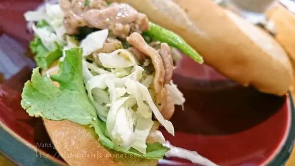 與椰奶一起炒過的綠咖哩雞肉搭配高麗菜絲和四季豆等蔬菜夾在其中,口感帶點微辣,綠咖哩加上椰奶的提味,豐富感更足夠,同時藉由蔬菜來解膩口,同時增加營養的均衡性。