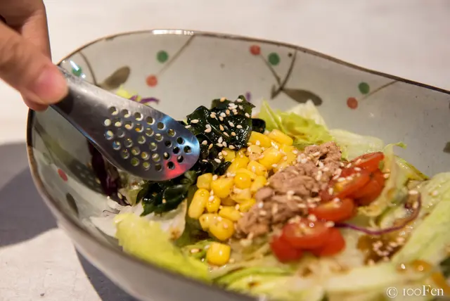 吃肉之前,先來點沙拉平衡一下。淋著和風醬的清脆生菜,拌著鮪魚、玉米、蕃茄及海帶,滋味很夠,食材也新鮮。此份量足夠兩到三人分食