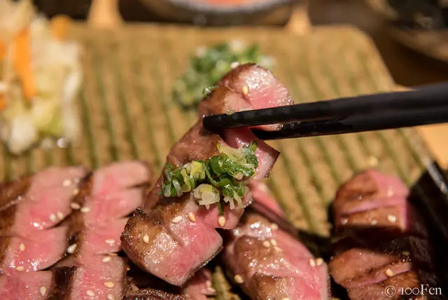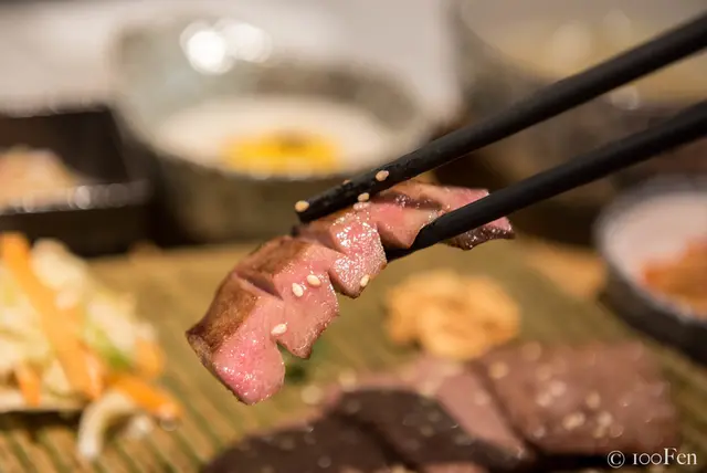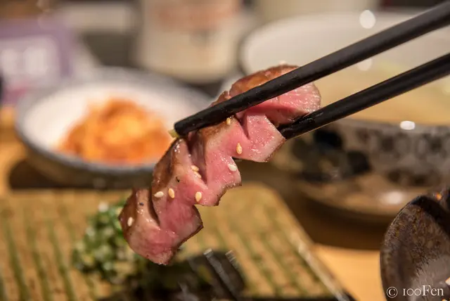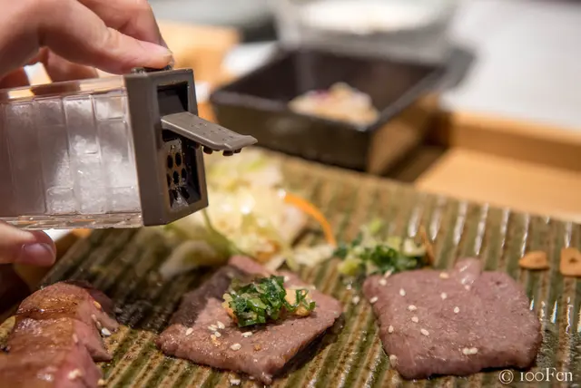 使用牛舌前端部位,肉質本身較有嚼勁、帶點微脆的口感,所以較適合做成薄切。薄切牛舌在烤時其實很難掌握熟度,以前在一般燒烤店所吃到的通常也都是前段的薄切,自己烤一不小心就過熟,馬上變的又老又硬;但這裡牛舌熟度掌握得剛剛好,視覺上有粉嫩的顏色,口感則是脆口Q彈,烤功真是一流!