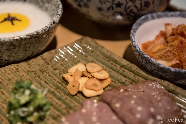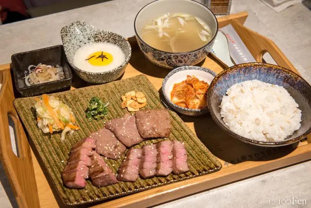 如果想一次吃到薄切+厚切牛舌,推薦點三拼定食,也很適合選擇障礙的人。除了牛舌本體,定食還附有小菜、麥飯,以及我很期待的牛舌湯
