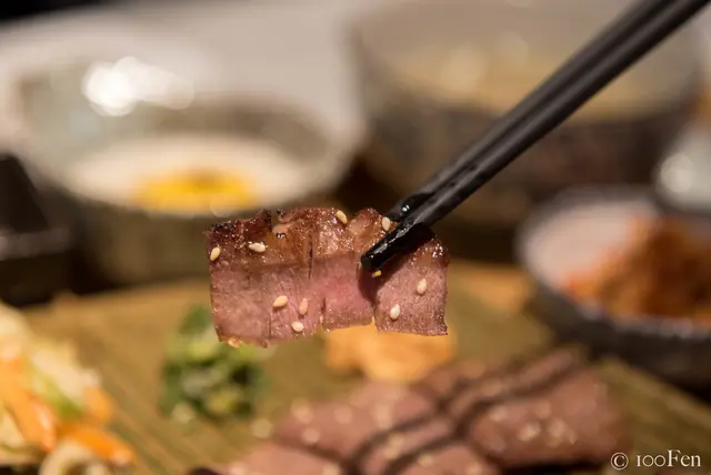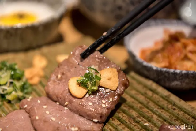 此行最期盼的,就是這道極厚切牛舌。取自牛舌舌根部位,和前/中段部位相比,是油花較多的部位、也是牛舌中價位最高的部位。這個部位在普通燒烤店就比較少吃到了,可能要到較高級的燒烤店才有,實在一解我對於牛舌的相思之愁