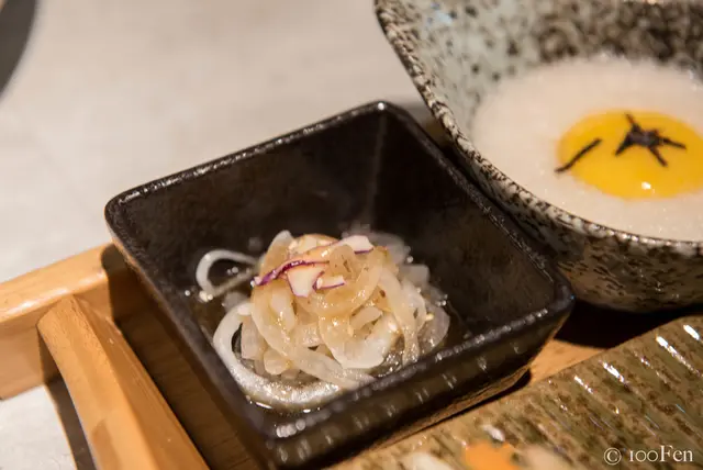 看看這個厚度,果真不負極厚切之盛名。仔細一看,粉嫩的牛舌之中帶有漂亮的油花,可以想見它入口的柔嫩程度,的確非常柔軟美味,令人驚艷。咀嚼間的香氣不絕,飽含肉汁,軟嫩和Q彈的比例大約是7:3,是很美好的平衡。吉村將牛舌熟度處理的非常好,推薦喜愛牛舌的人一定要點極厚切