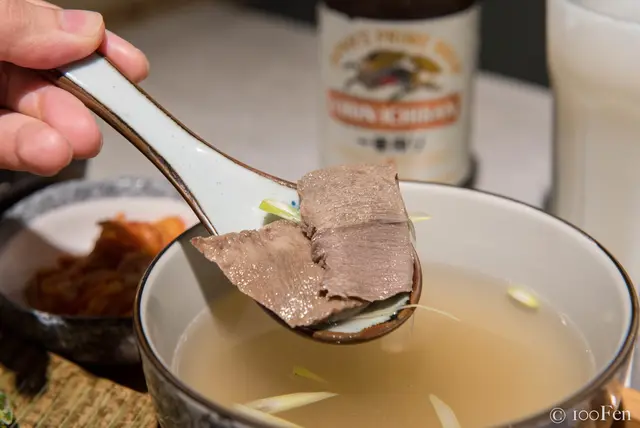 凡是點牛舌定食,都會附上店家用牛舌熬製的牛舌湯。如果點非牛舌的定食是附上味噌湯。其他牛舌專賣店一般都是提供牛尾湯,但我自己更愛牛舌湯,原以為牛舌煮到全熟會很難咬,結果完全出乎意料,因為切的薄,吃起來脆口又帶有牛肉香,意外美味。湯頭吸飽了牛舌精華,喝起來香氣鮮味都十足,從這碗湯便可以看到店家對於細節的用心
