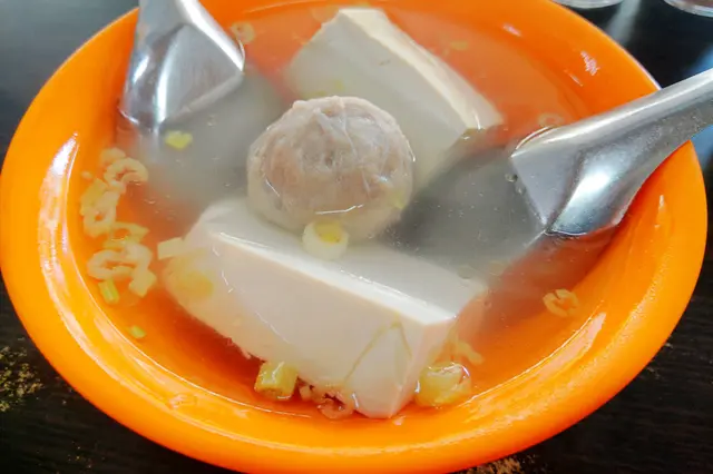 兩塊嫩豆腐+一顆貢丸,清甜的湯頭撒點香芹後就能上桌,