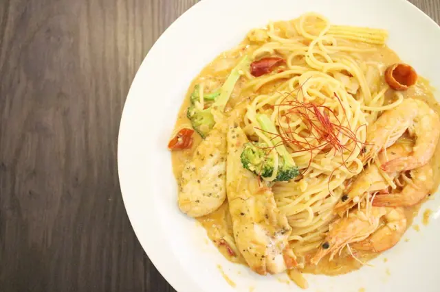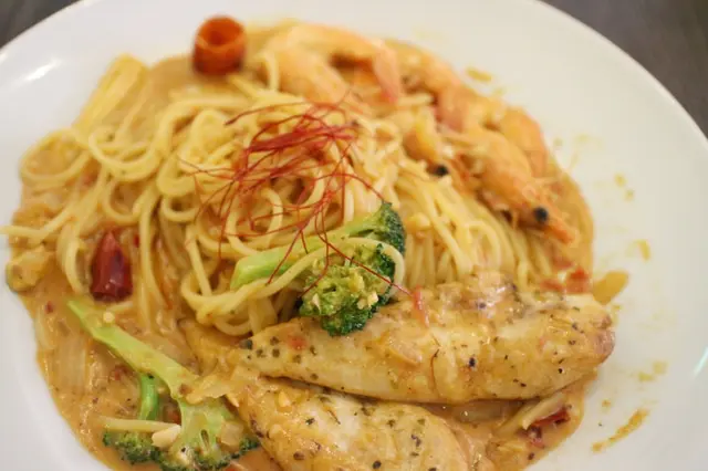 雞肉稍嫌乾柴,但蝦子表現如前菜沙拉相同完美,選用有麵芯的義大利麵麵條吃起來有嚼勁極了