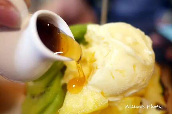 就是那就是他們家在剉冰上面淋的不是一般的糖水,而且用鳳梨去熬煮的鳳梨糖水,