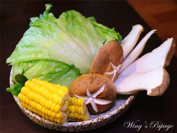 有杏飽菇、香菇、超甜玉米及包燒肉的生菜。