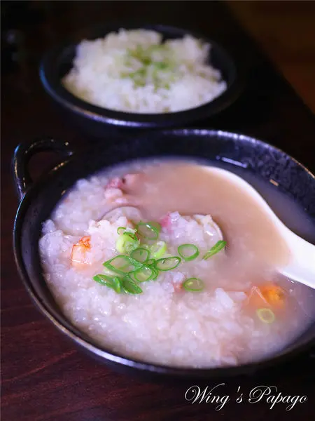 海鮮粥內有魷魚、蝦子、蛤蜊及干貝絲,米粒熬的軟嫩入味,嚐來富含海鮮鮮味;