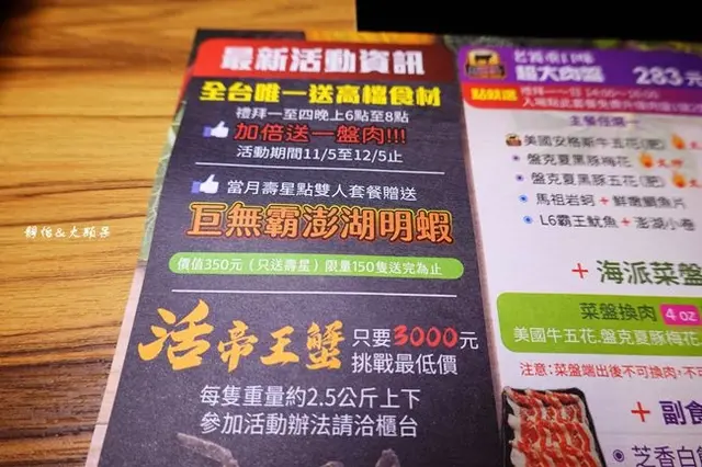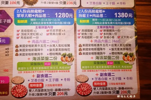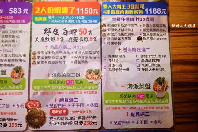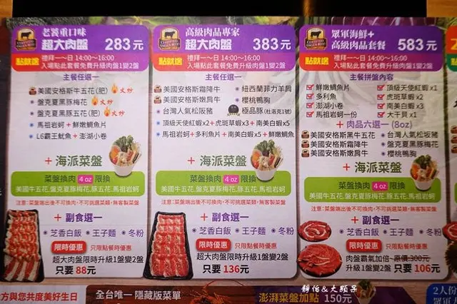 菜單很大一張,超大肉盤283元起,優惠資訊菜單上都寫得相當清楚,兩個人來吃可以直接點雙人套餐會更划算!