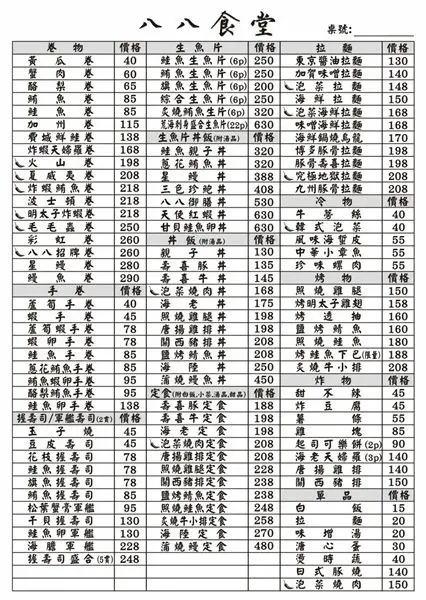 【八八食堂】菜單及價格