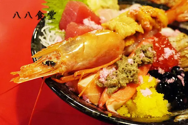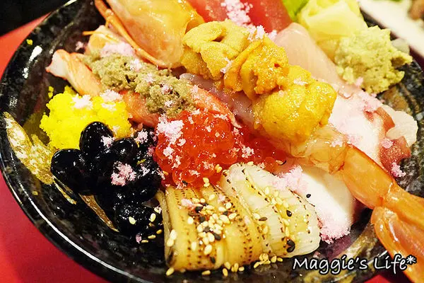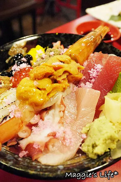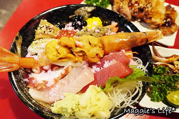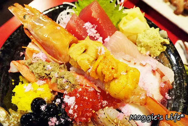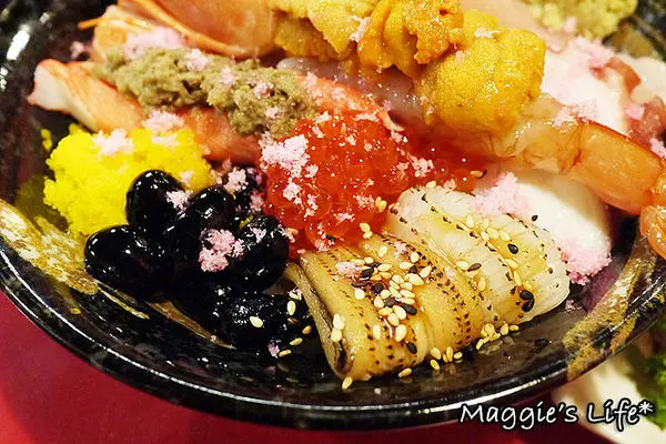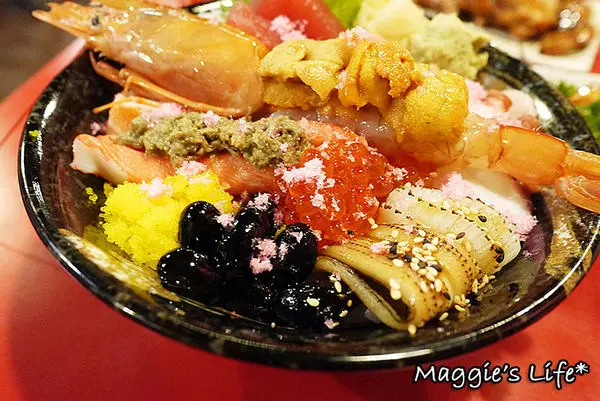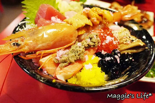 「天使紅蝦丼」這碗真的是塞到滿塞到好,裡面數不清的生鮮漁獲,大約有十多種之多,色彩繽紛讓人目不暇給。
