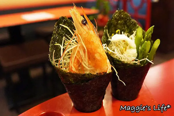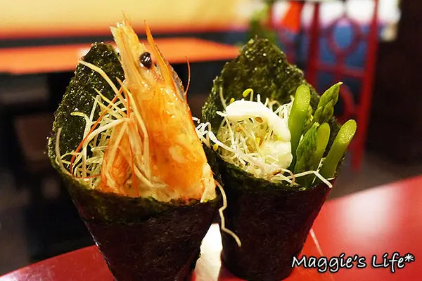 「蝦手捲」35元&「蘆筍手捲」30元,這都是常見的手捲料理,蝦手捲裡放的是整尾鮮蝦中段去殼處理,搭配新鮮蔬菜,快快吃才能保留海苔的脆度。