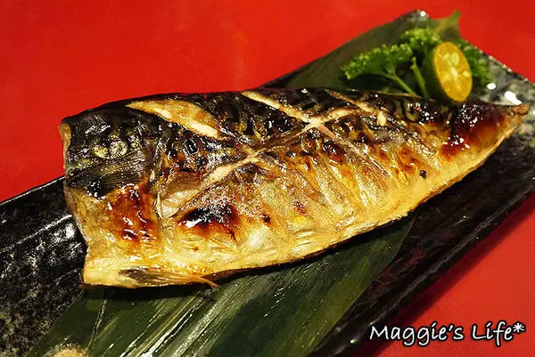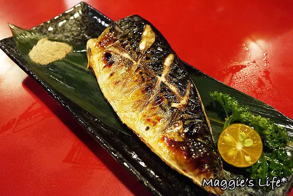 「鹽烤鯖魚」150元,色澤烤得油油亮,搭配新鮮桔汁和胡椒塩就對味啦!