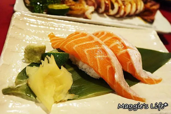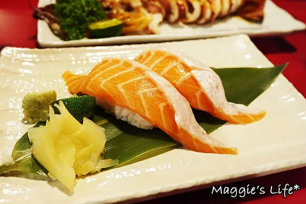 「鮭魚肚握壽司」68元,光看閃亮亮的油質就知道會是新鮮好料,吃在嘴裡滿是滑嫩的口感,而且超大一片的蓋在醋飯上。
