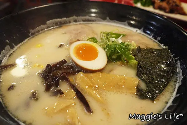 「博多豚骨拉麵」188元,我也有一陣子沒吃到拉麵了,這裡面有半顆溫泉蛋,滷荀絲、黑木耳、玉米、海苔和蔥花入味。