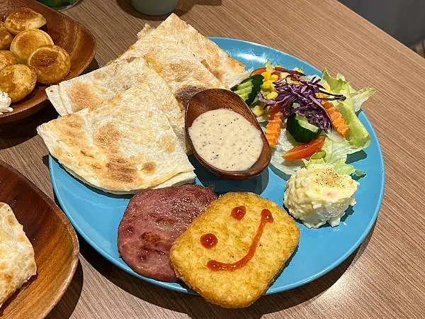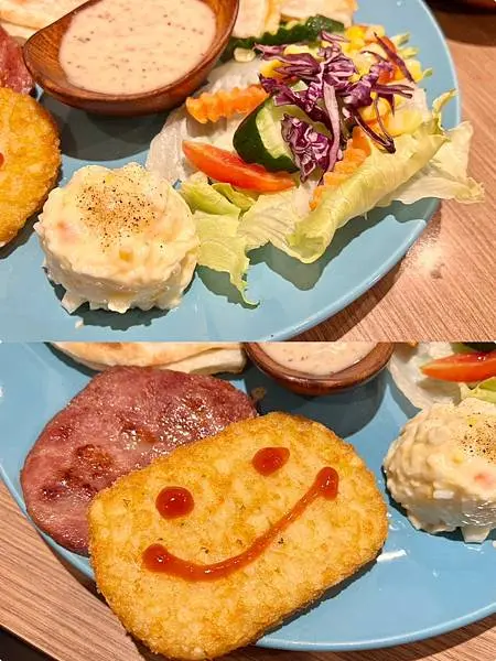 清爽生菜沙拉、濃郁濕潤馬鈴薯泥、帶著笑臉的鬆餅,還有我超愛的餐肉,吃起來有台灣香腸的味道,有夠豐富吃好飽