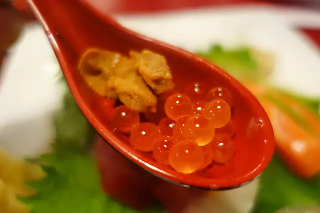 最簡單的就是用湯匙大口挖來吃~一次吃下鮭魚卵跟海膽