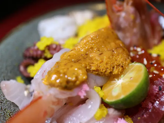 大隻的天使紅蝦上還放上一大片的海膽,只好自己獨享不分給老公了
